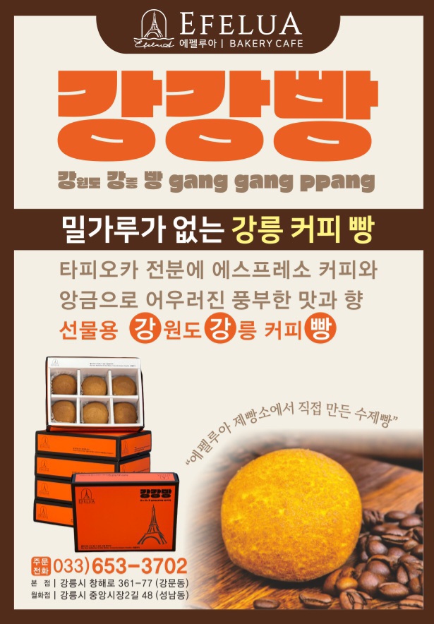 선수 바리스타가 직접 로스팅한 커피, 프랑스 정통방식 바게트, 크라우상, 천연발효종빵, 수제쿠키, 스콘, 초당순두부카스테라, 강강빵 등 100여종의 제빵 제과와 시그니처 음료와 빙수를 이곳 에펠루아에서 모두 경험할 수 있습니다.