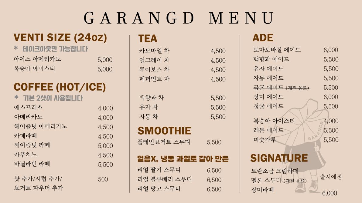 키워드: 스페셜티커피, 수제청, 수제요거트, TWG차, 귀리우유