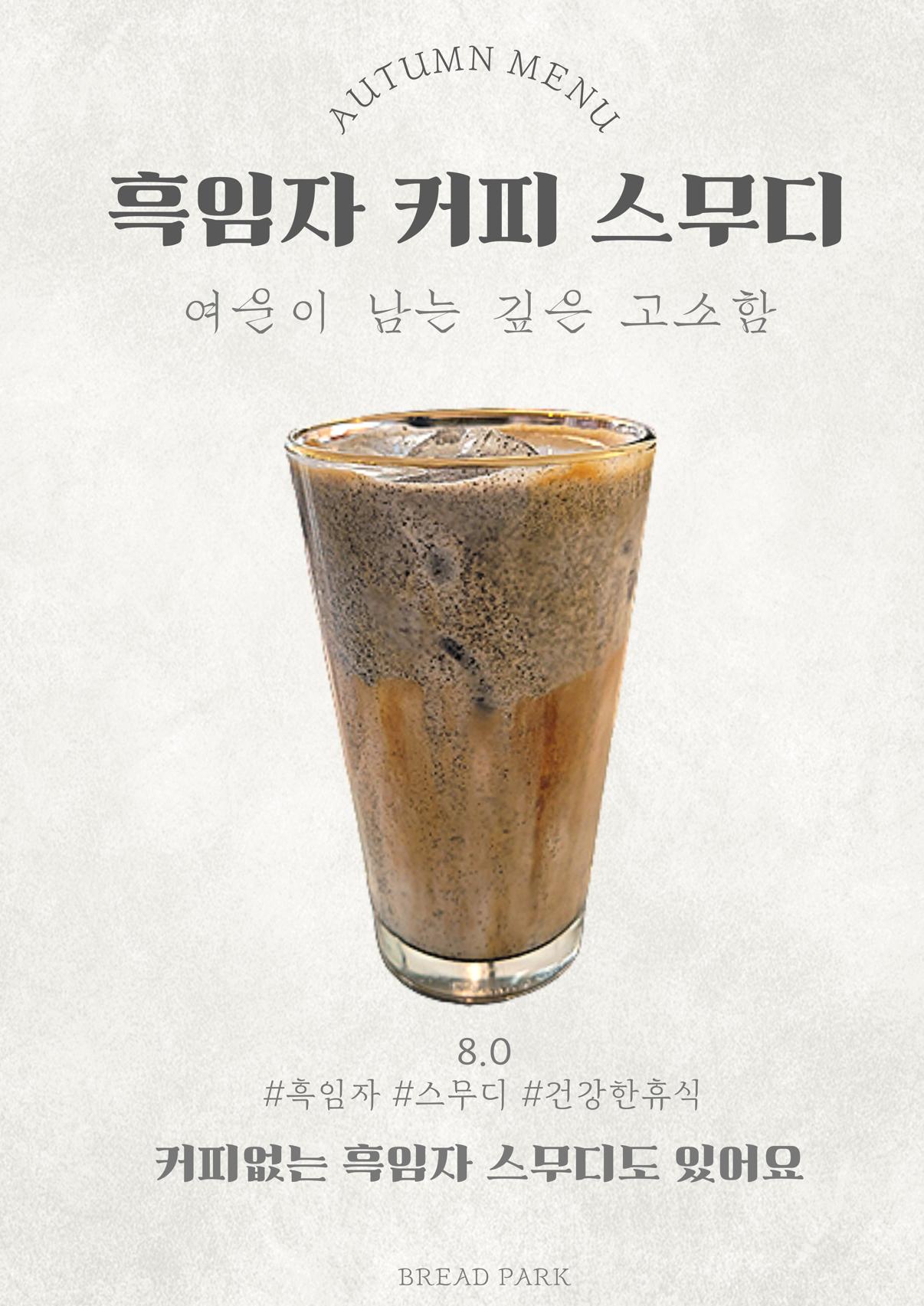 키워드: 흑임자커피스무디, 바닐라라떼, 파파야주스, 소금빵, 몽블랑