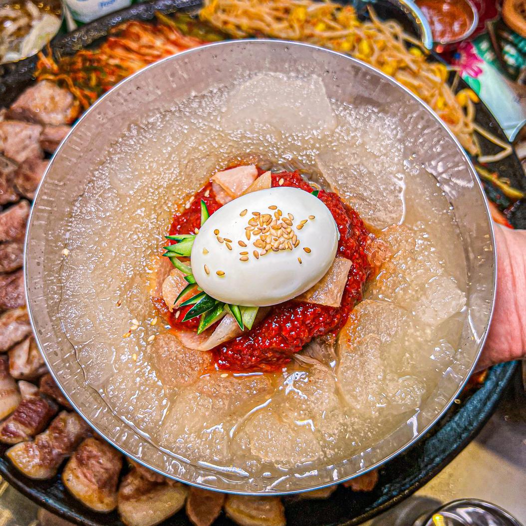 신선한 미나리면과 보쌈의 완벽한 조화