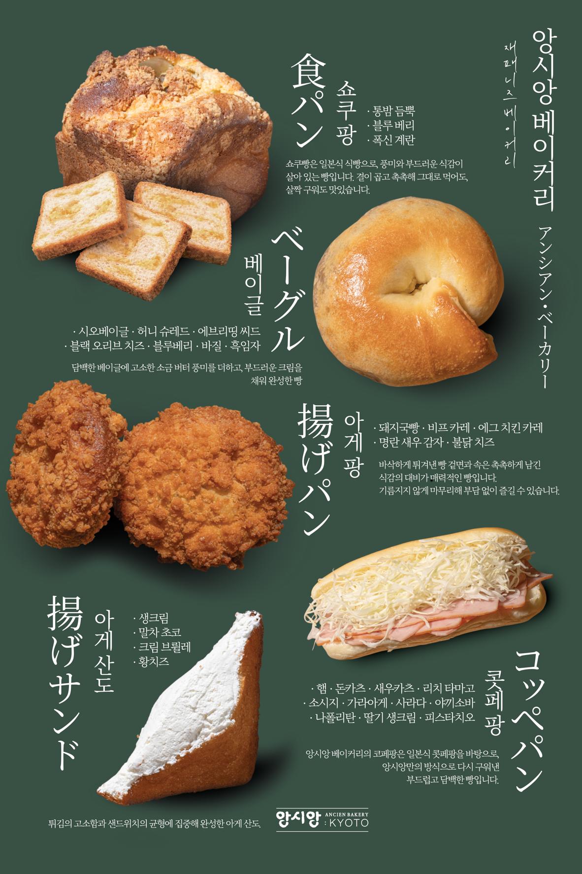 프랑스어로 오래된 이라는 단어적 뜻의 앙시앙은, 시간의 자연발효, 기원전부터 만들어진 빵의 본질과 오래되어 버려진 정원이라는 공간 컨셉의 내용까지 함축하여 담아냅니다.