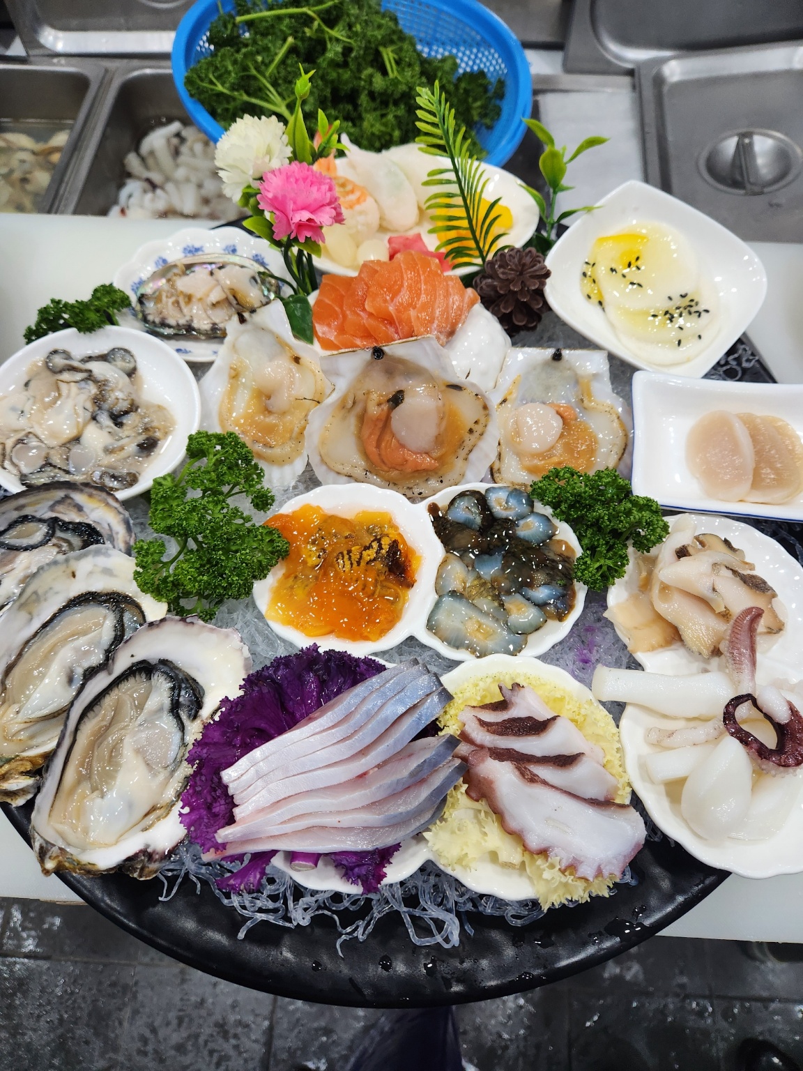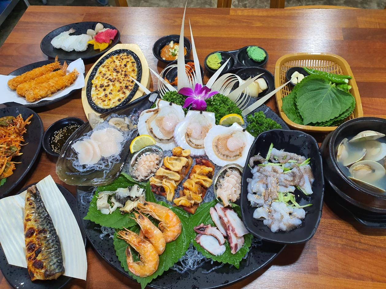 살아있는 대하, 전복회, 해삼, 멍게, 게불, 소라,