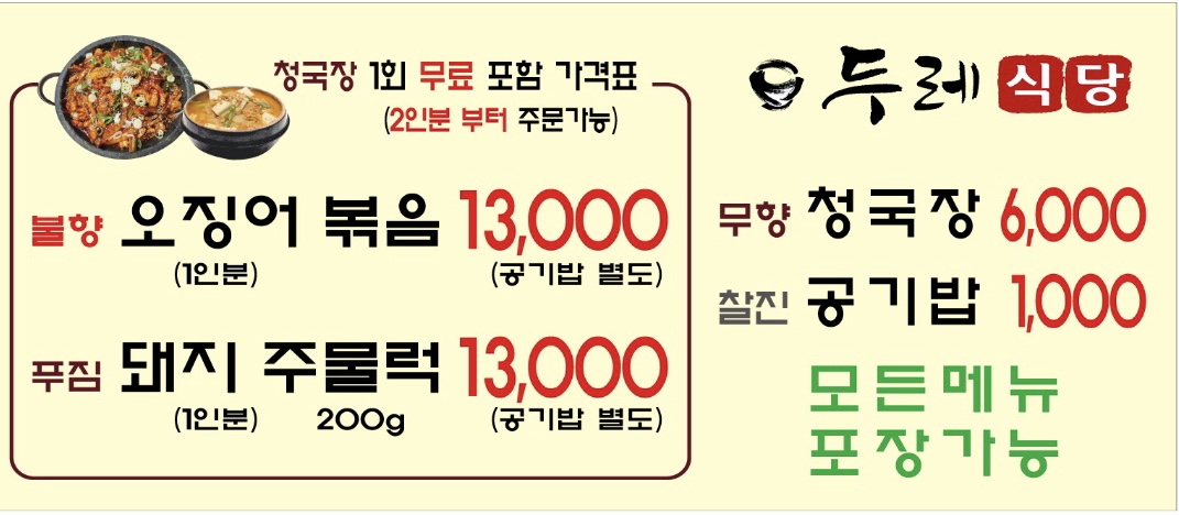 키워드: 오징어볶음, 청국장, 돼지주물럭, 남원오징어볶음, 불향오징어볶음