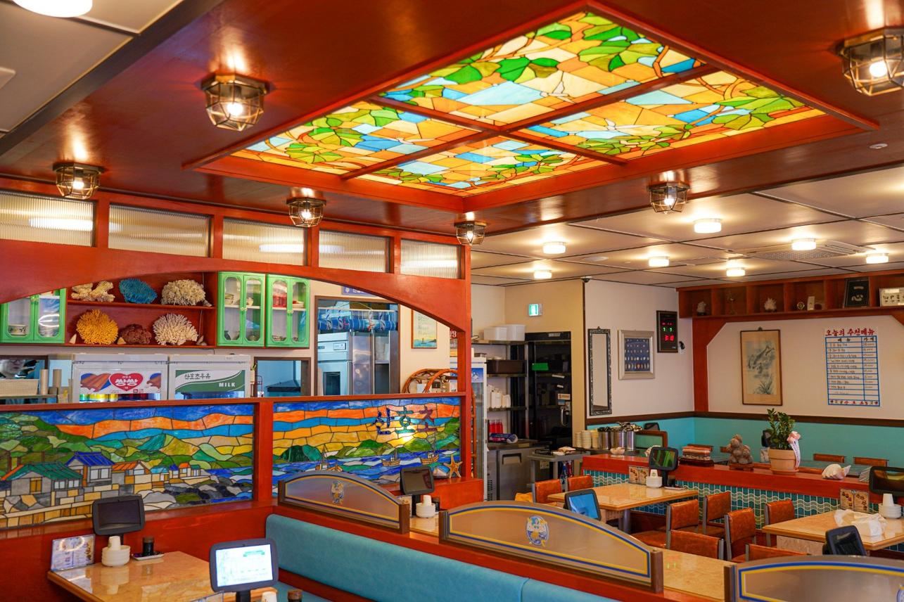 스테인드글라스와 빈티지 간판이 보이는 외관이 특징이며,