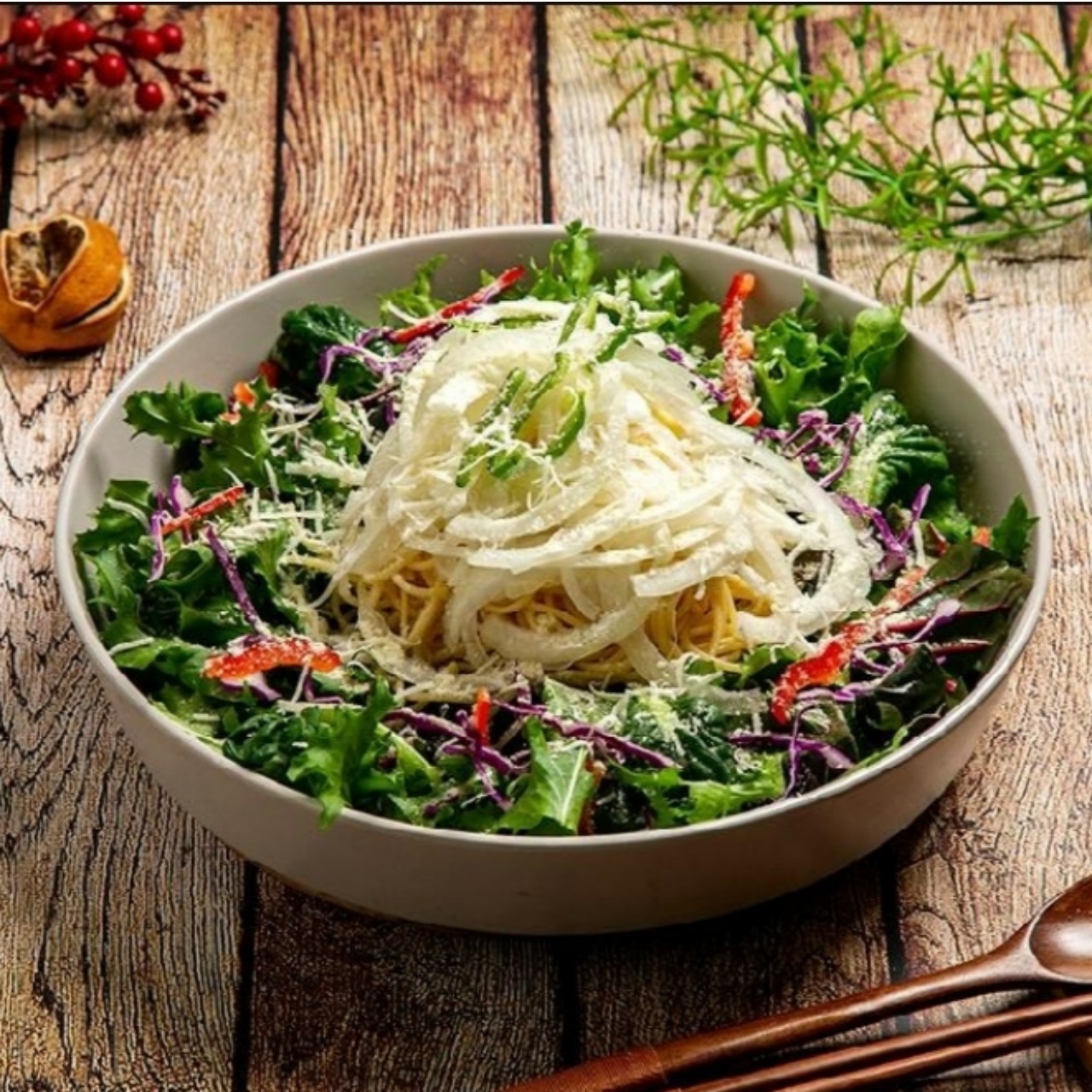 신선한 재료가 가득한 샐러드 파스타
