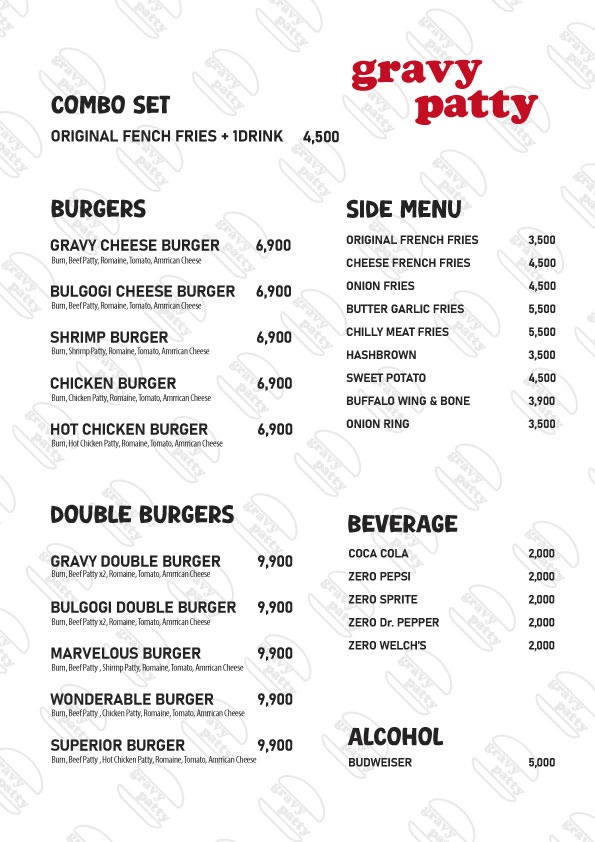 키워드: 치즈버거, 더블치즈버거, 프렌치프라이, 타바스코윙, 칠리치즈프라이
