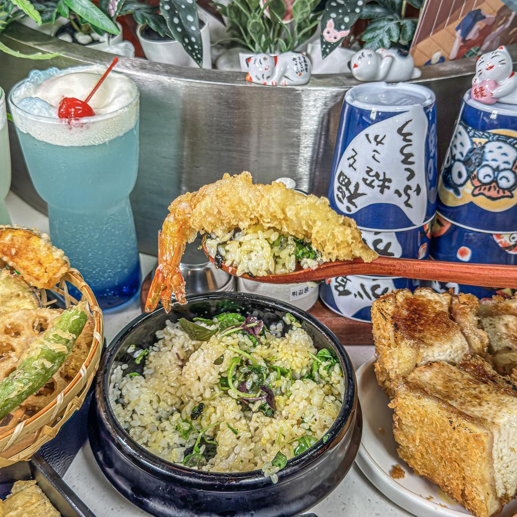 따뜻한 솥밥에 얹은 신선한 튀김의 맛