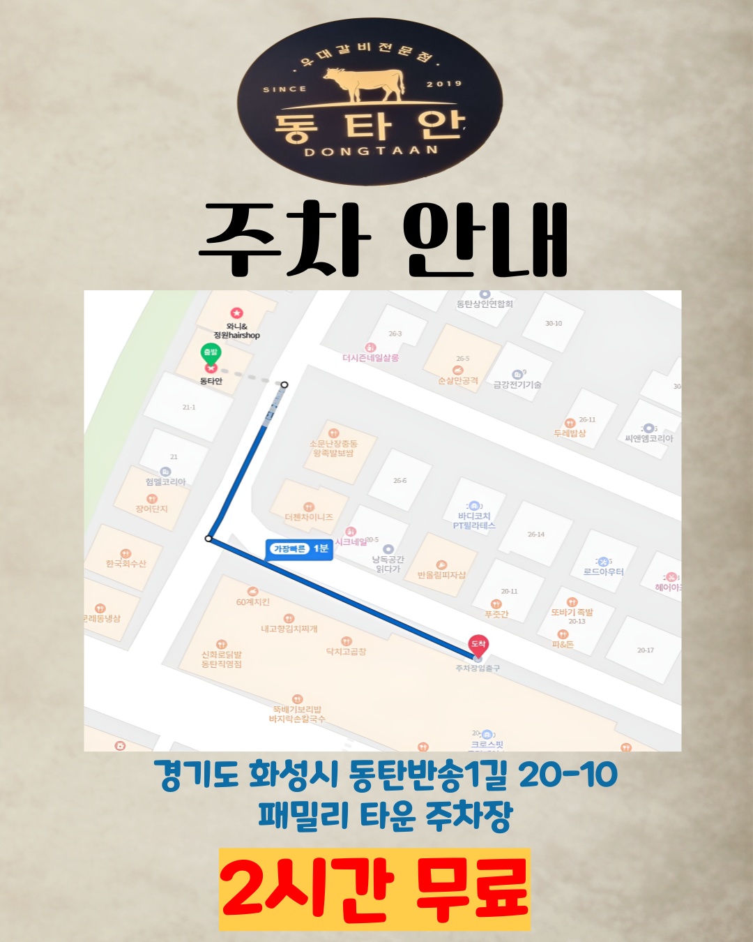 네비에 '동타안 동탄본점' 또는 '경기 화성시 반송동 38-6' 검색하시고 방문해주시면 됩니다!