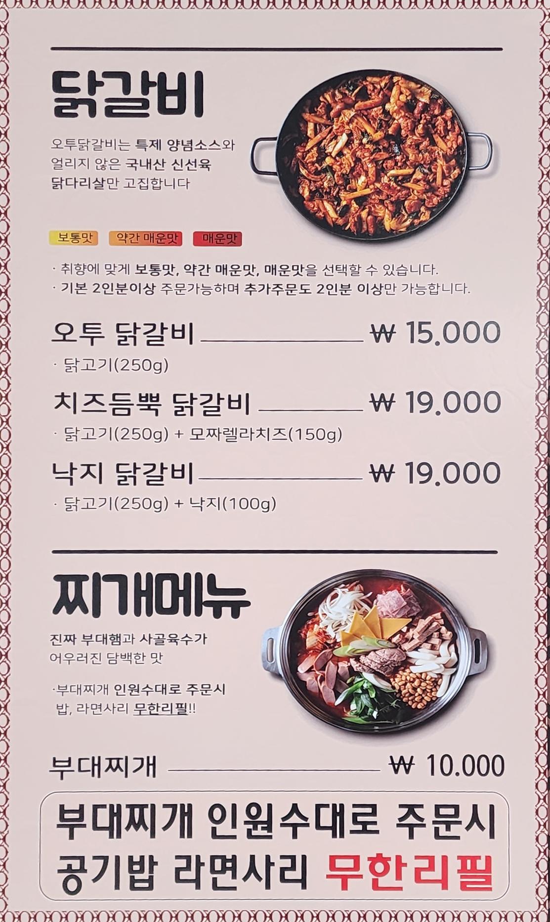 키워드: 부대찌개, 막국수, 오투닭갈비, 치즈닭갈비, 낙지닭갈비