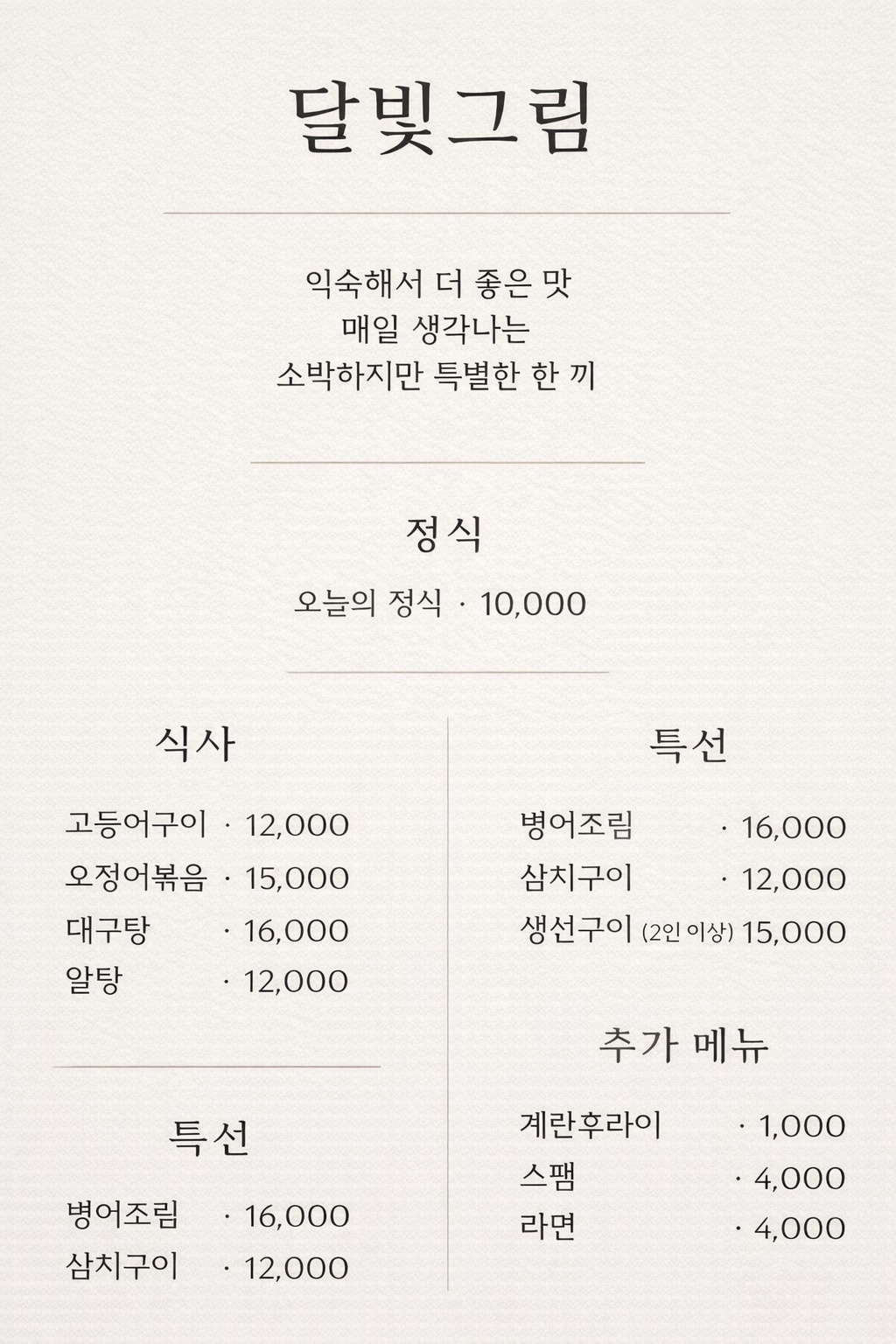 키워드: 백반, 고등어구이, 오징어볶음, 알탕, 대구탕