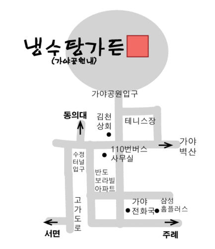 가야공원 입구-가야포차선지국밥, 커피베이, 냉수탕가든 인근에 위치해있습니다.