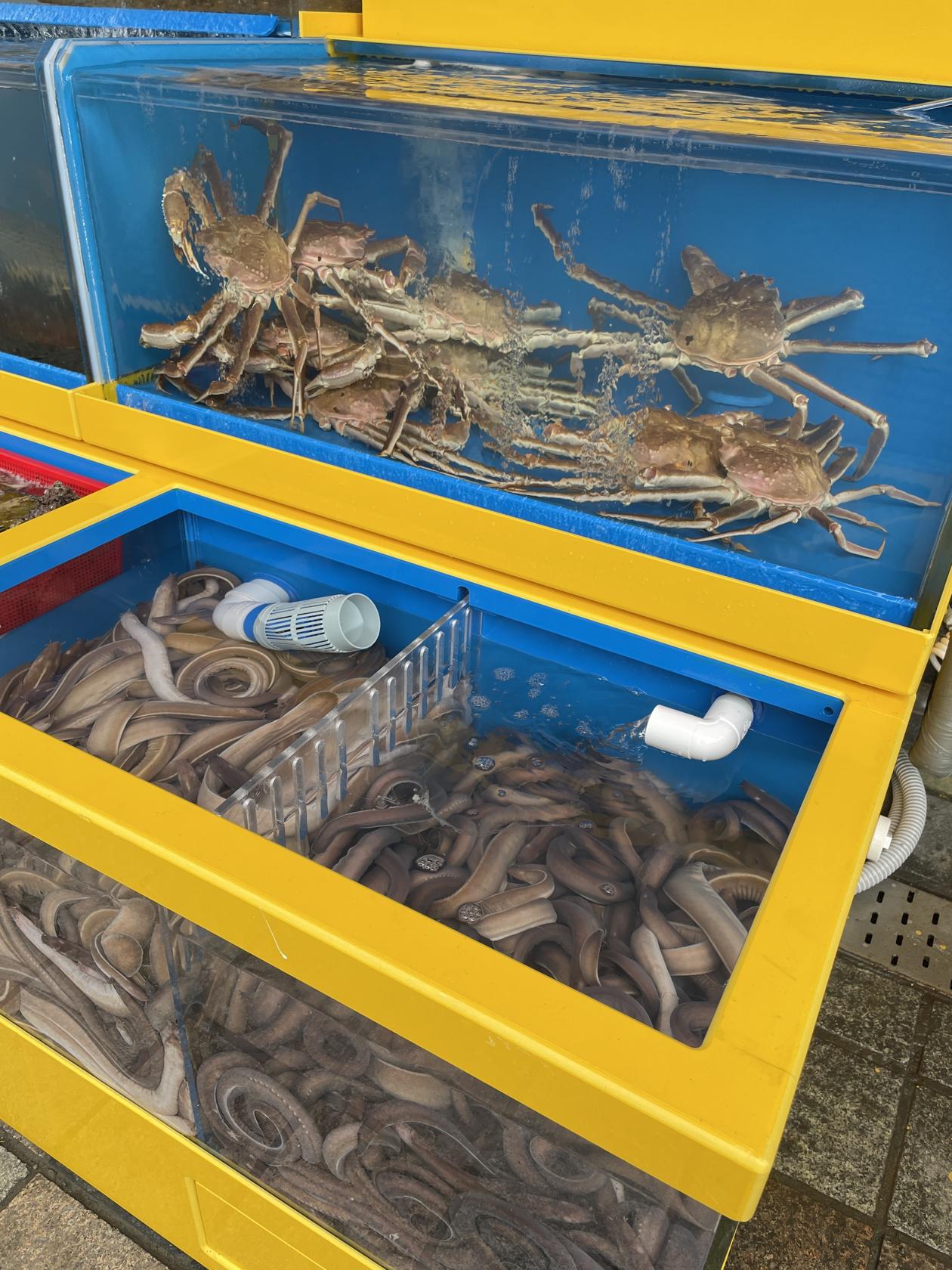 통로를 따라 직진합니다. 이 통로에는 다양한 해산물 가게와 음식점이 즐비해 있어 구경하면서 걸을 수 있습니다.