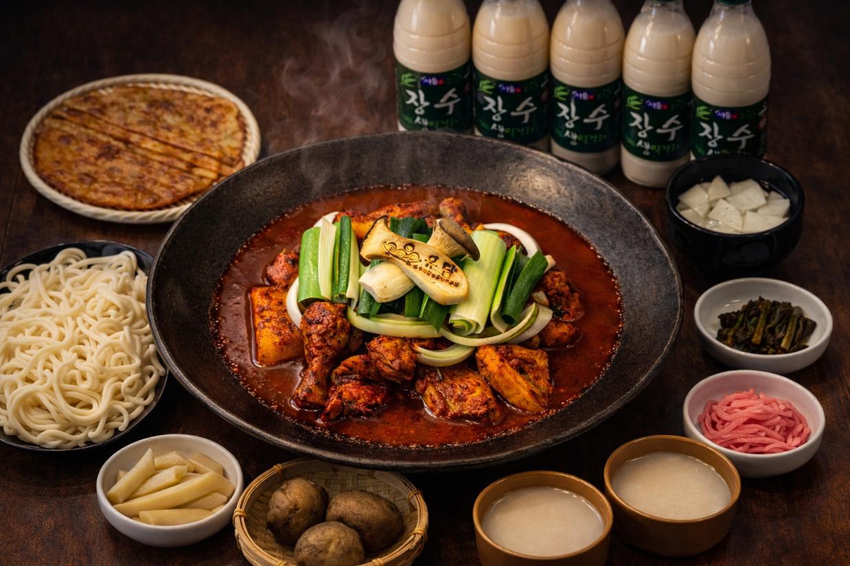 키워드: 닭볶음탕, 한식, 납작만두, 볶음밥, 주류
