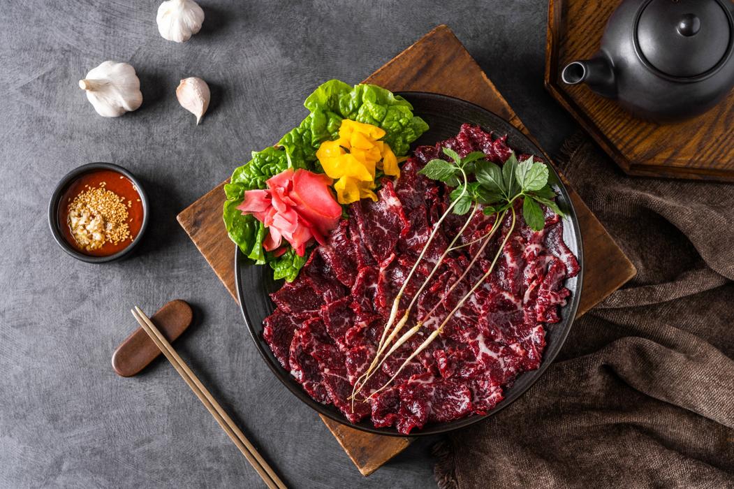 신선한 재료로 완성된 생고기 비빔밥