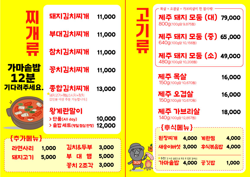 키워드: 김치찌개, 가마솥밥, 오겹살, 돌솥밥, 제주생고기