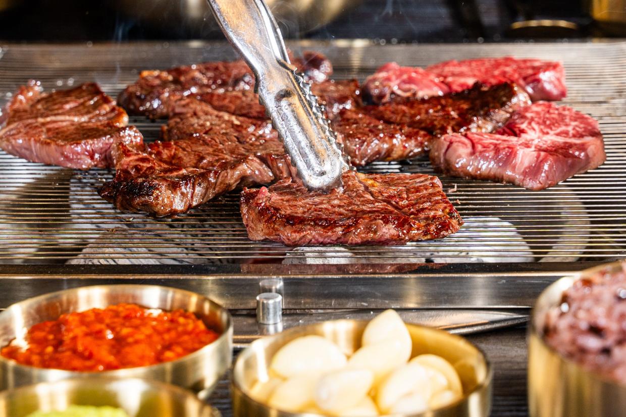 갓 구운 고기와 한강라면의 환상 조합