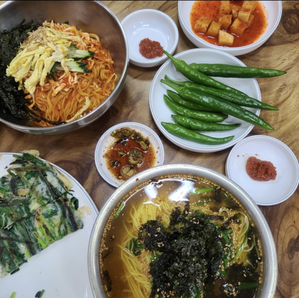 키워드: 잔치국수, 비빔국수, 콩국수, 칼국수, 부추전