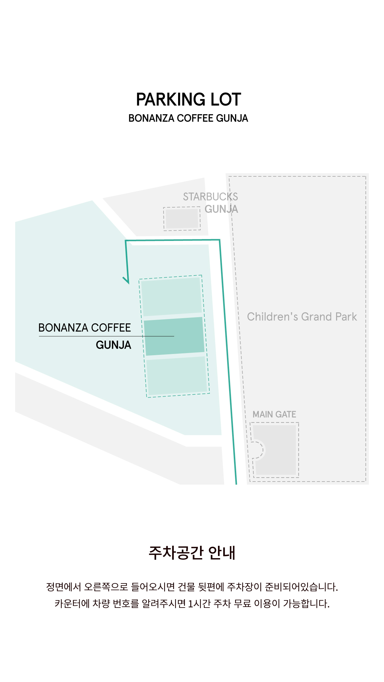 오시는 길: 보난자커피 군자점은 군자역 7번출구에서 도보 10분 거리에 위치해 있습니다. 매장 이용 시 1시간의 무료주차가 가능합니다.