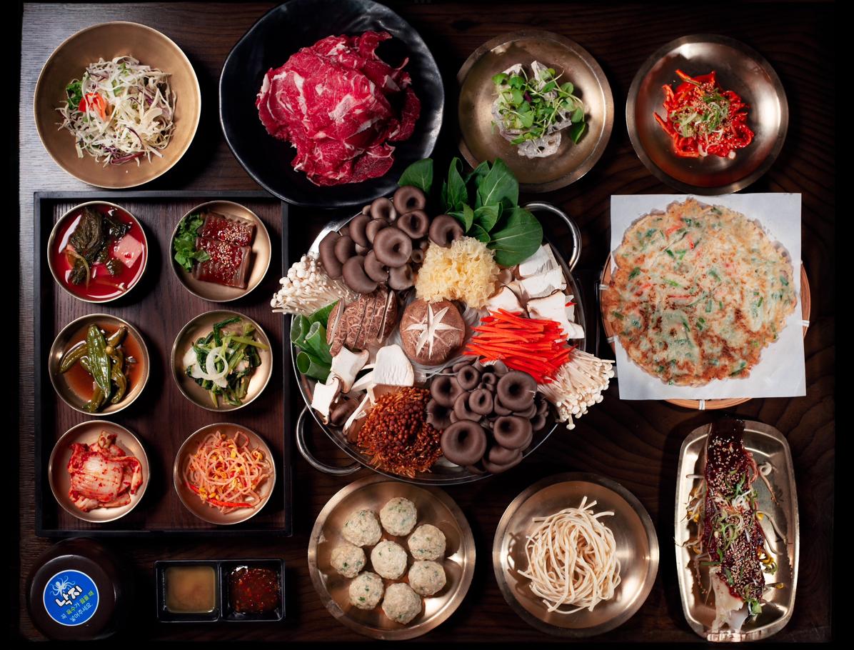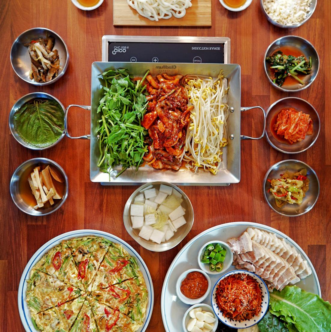 신선한 고기와 풍성한 반찬의 조화