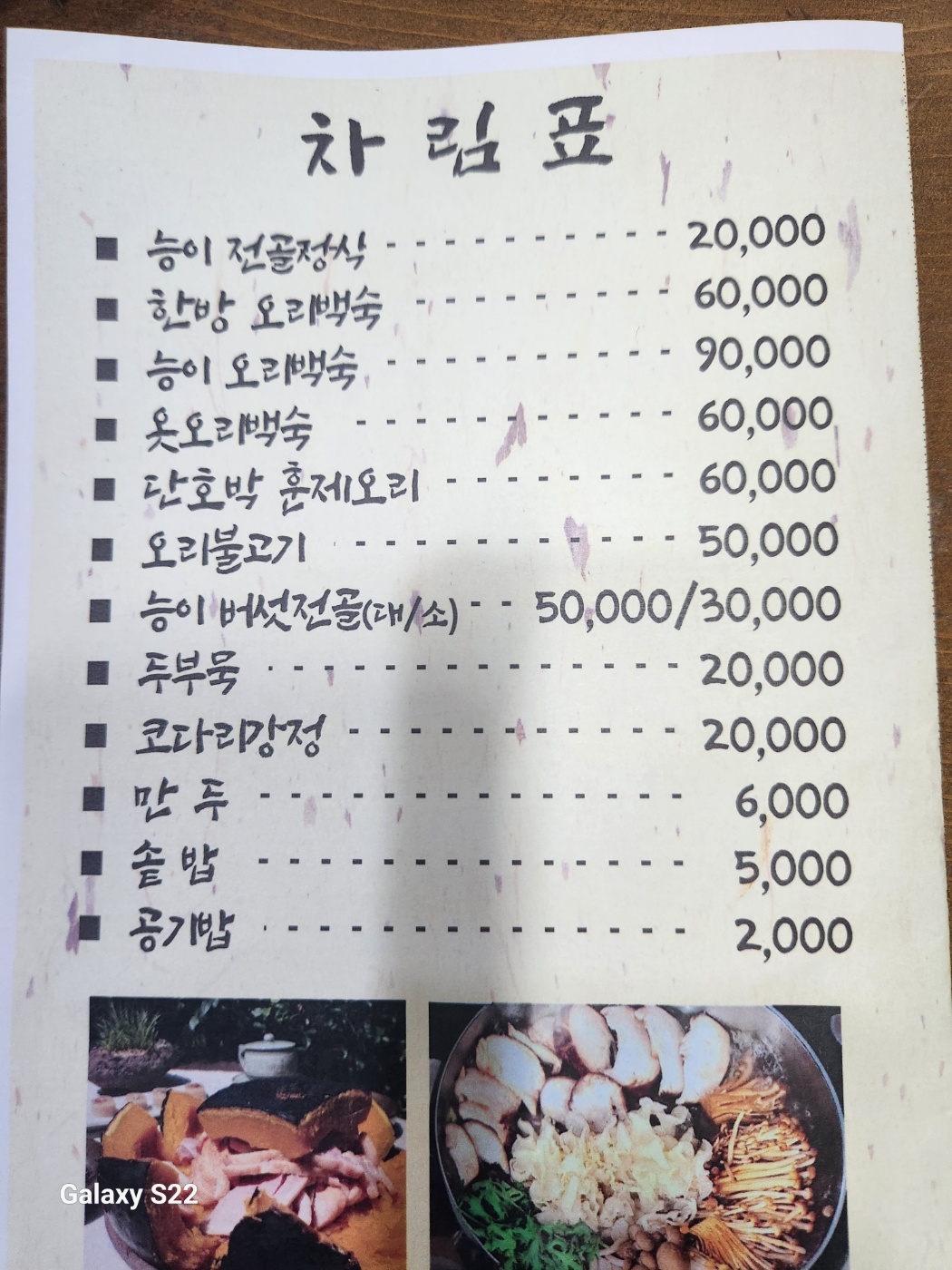 키워드: 솥밥정식, 단호박훈제오리, 능이전골정식, 한방오리백숙, 능이버섯전골