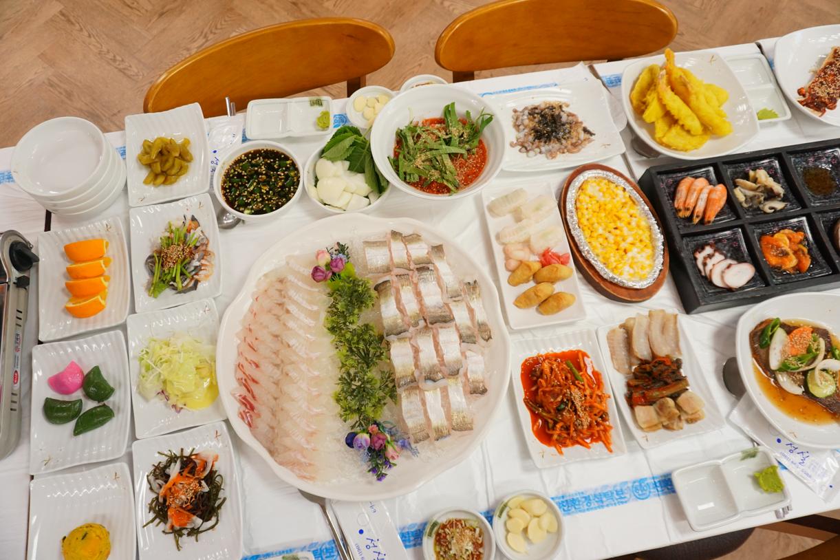 두툼한 회와 풍성한 밑반찬의 조화