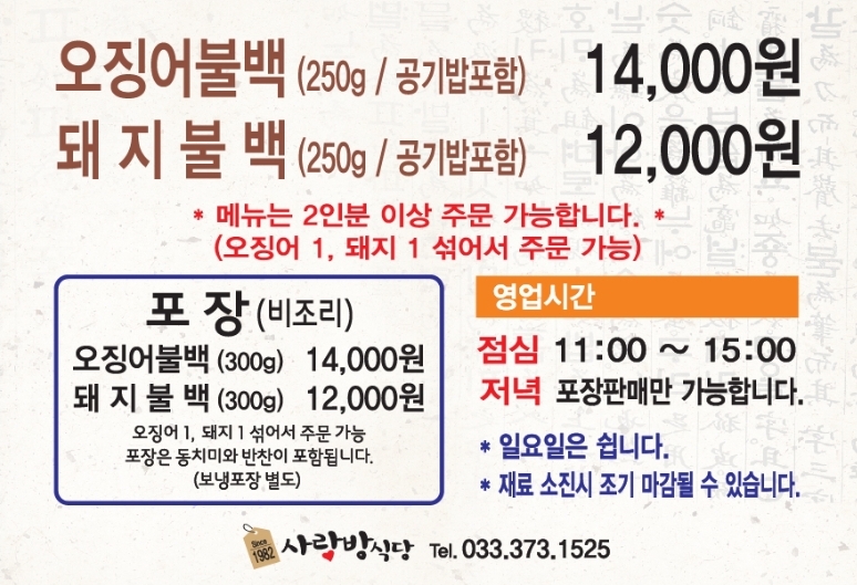 키워드: 오징어불백, 오징어볶음, 돼지불백, 제육볶음, 영월