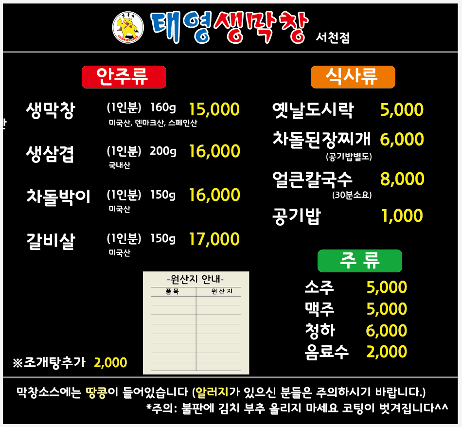 주소: 경기도 용인시 기흥구 서천로127번길 3-3 에스비타운 101호 태영생막창 서천점