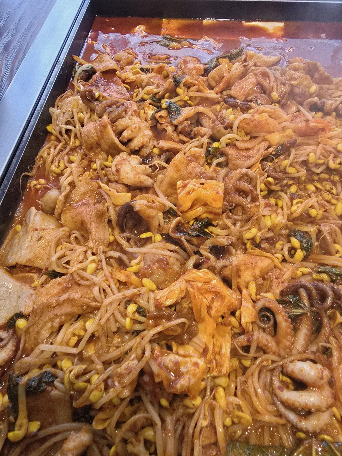 넓은 철판에 담긴 풍성한 맛