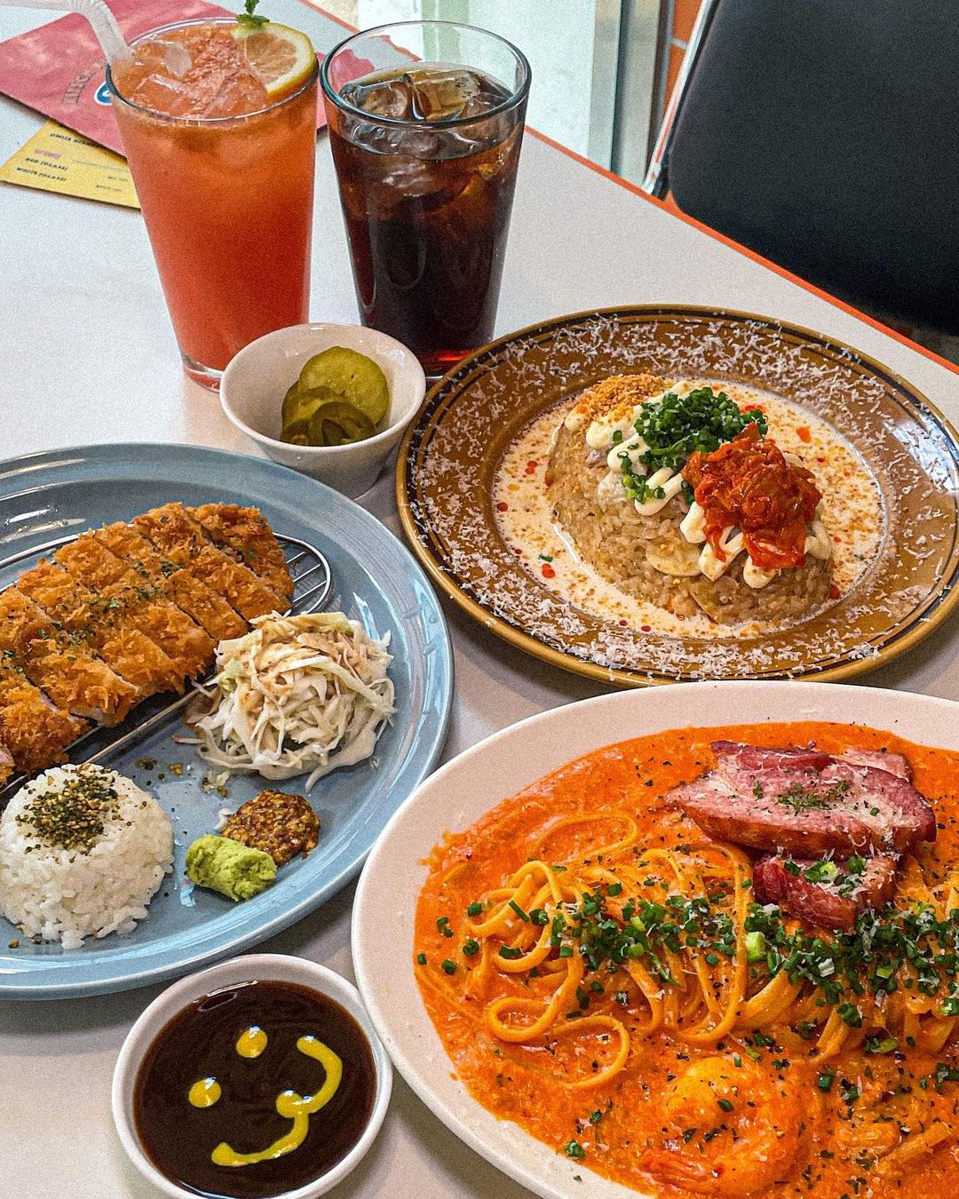 시그니처메뉴 김치 오믈렛, 등심 안심 돈카츠, 청양 베이컨 크림파스타, 통베이컨 로제파스타 등 맛있는 요리가 많이 준비되어 있어요.