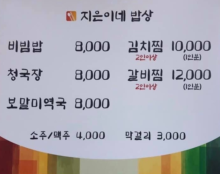 키워드: 정식, 비빔밥, 갈비찜, 김치찜, 청국장
