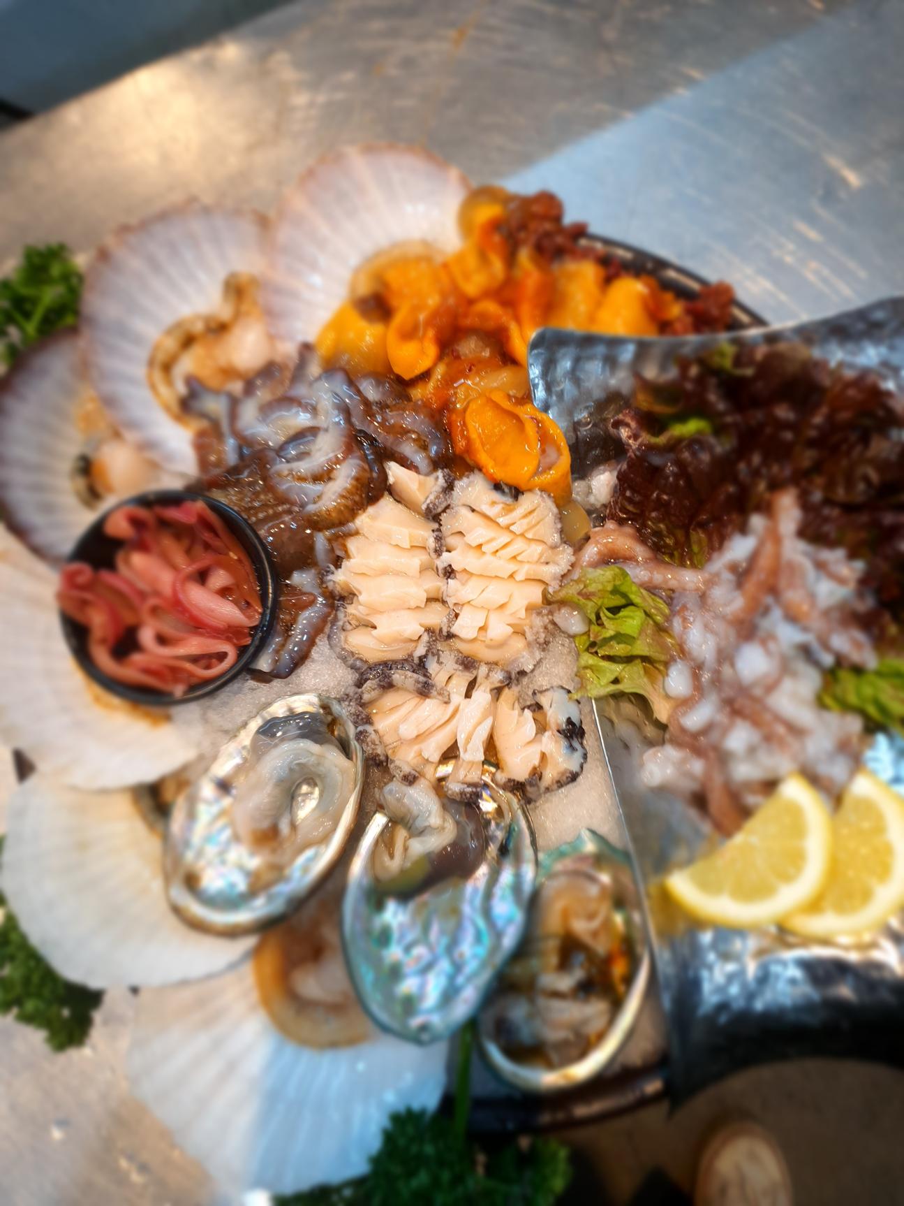키워드: 참치회, 메로구이, 왕새우튀김, 우니단새우, 알베기꽃게장