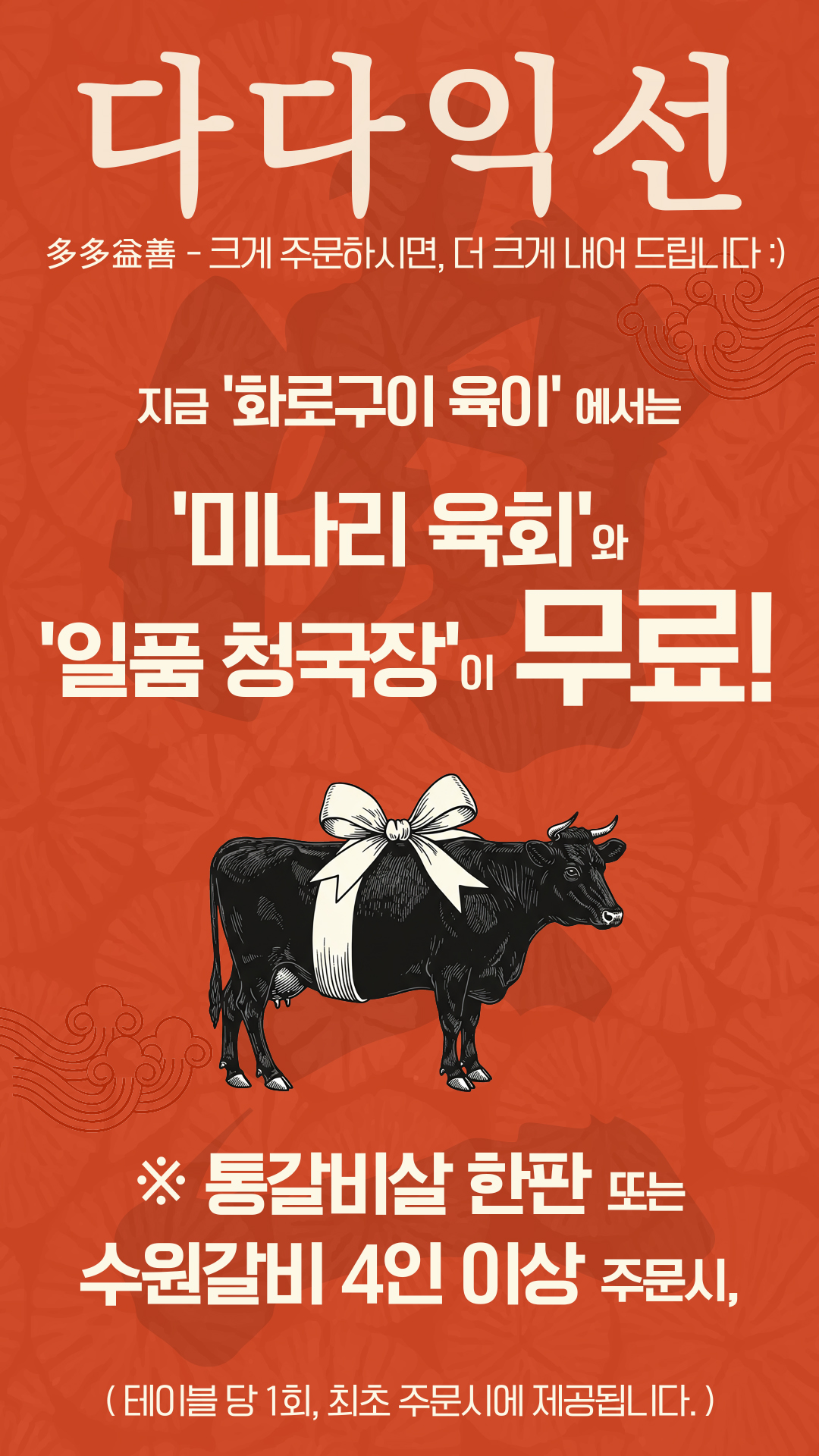 가족식사와 회식의 맛집 비중은 절대적! 가족과 회식 같은 특별한 날을 위해 밥집도, 술집도 화춘가든. 소갈비, 육회, 다양한 주류까지!