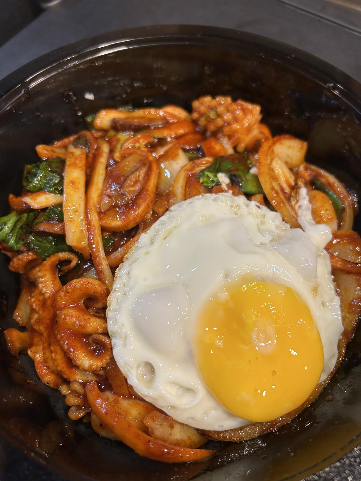 돌판 위에서 완성된 해물짜장면의 풍미